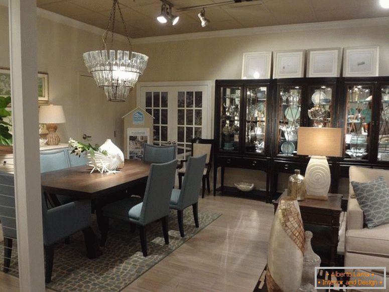 Бірузовая аздабленне сцен у кухні робіць памяшканне больш прасторным. Лаканічная, сціплая мэбля арганічна ўпісваецца ў агульны інтэр'ер у стылі эклектыка.