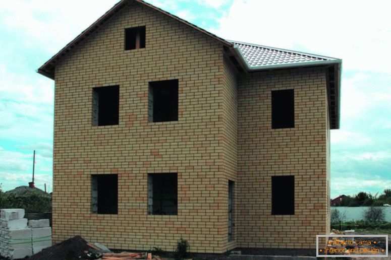 Пярэдні пакой ўпрыгожана дэкаратыўнымі палічкамі. Цікавае дызайнерскае рашэнне для загараднага дома.
